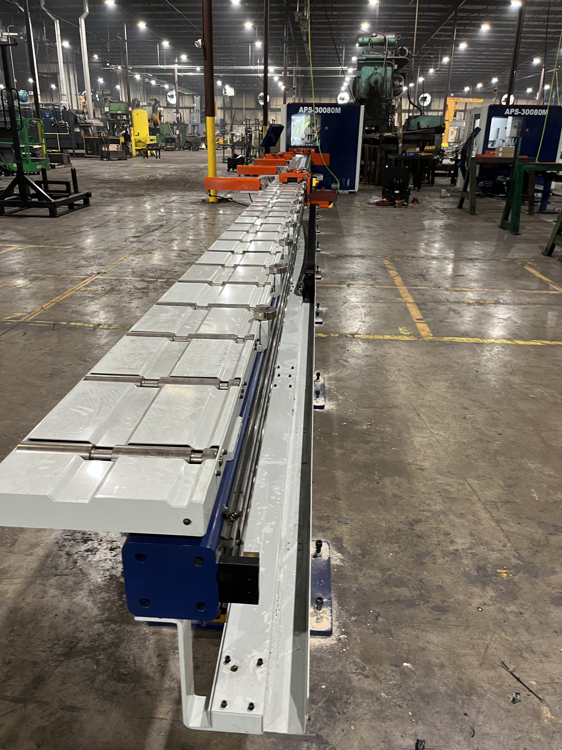 The SUNRISE APS is a fully automatic plate and flat-bar processing system with triple punch. The operator loads the flat bar onto the all-steel in-feed rollers, the system engages the material with pneumatic clamping and squaring devices and then processes the material by automatically punching and shearing to length utilizing the industrial strength rack and pinion drive system. Averaging 4 seconds per operation, your average 12”x 12” base plate with 4 holes, can be completed in less than 20 seconds! The SUNRISE APS, an advanced plate and flat-bar processing system, revolutionizes the manufacturing process with its fully automated operations and optional triple punch capability. Designed for efficiency and precision, this system combines cutting-edge technology with robust construction.